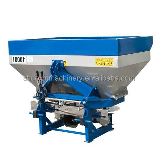 Fertilizer spreaders mounted to the Tractors through three point linkage system. It is powered by throughout a rod by tractor PTO and linked up by spreader discs and smashers in the tank.
